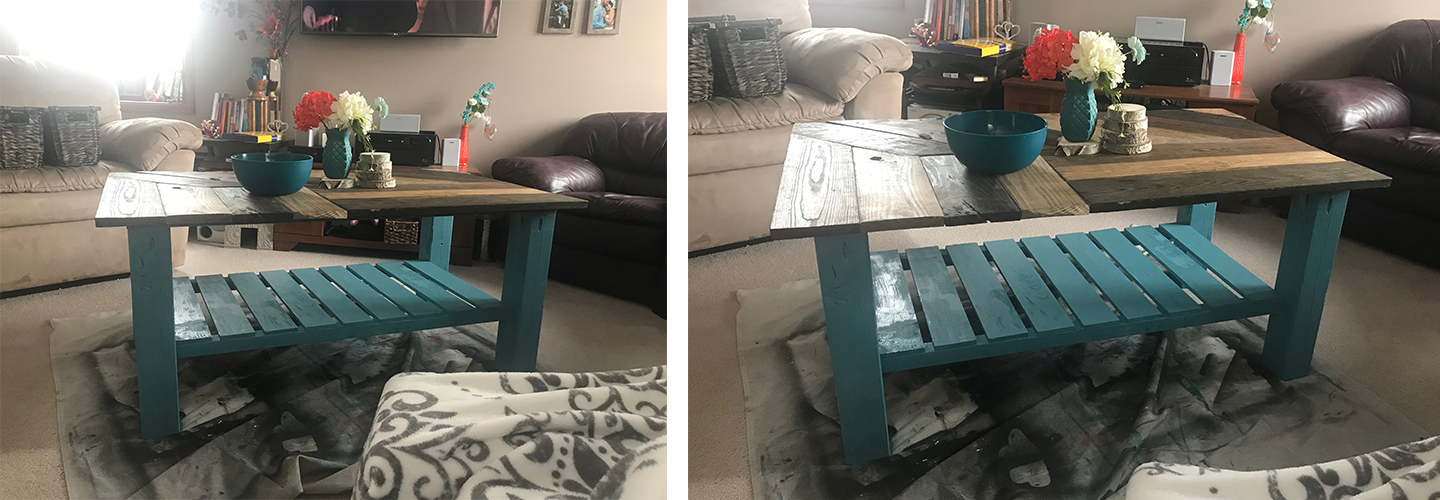 The wood spool table was okay but we wanted something different. So many ideas, so little time turned in to so many ideas equals paralysis by analysis. I had previously tore apart a dozen or more pallets for various projects and so I had quite a bit to choose from: different types of wood, colors, shapes, and conditions. And, of course, the engineer mind kicked in so I had to make the most efficient use of the already cut pieces while maintaining a certain creativeness. That’s pretty much how the design layout of the top was born. As cool as pallet wood can be in a final product, working with it can really be a pain. This could turn into a three page long thing so I’ll speed it up here. Couldn’t get thin wood leveled out. Couldn’t pocket hole because the edges of the boards are rounded. The screws I had on hand that were the proper length were fine thread. Ugh. Okay that’s over. With the top done, I whipped together the legs and bottom shelf pretty quickly. We’ve had a number of positive comments on it but i just see the flaws. That said, I really like this thing…but more importantly – SHE DOES!!